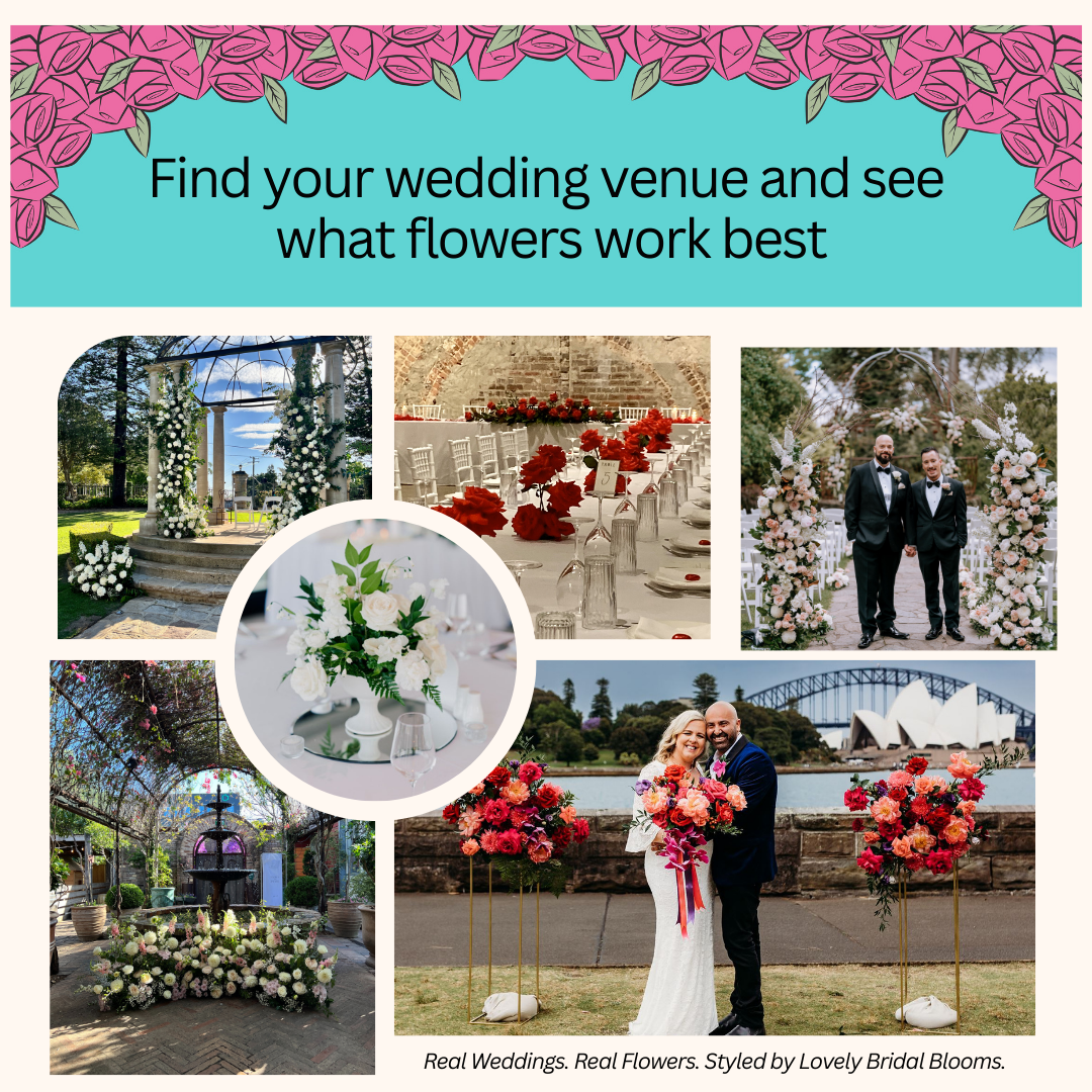 Choosing wedding flowers is easier when you can see what actually works in your space. We have styled weddings at many of Sydney’s most popular venues, as well as locations across the Blue Mountains, Southern Highlands, and beyond. Click through to find your venue and explore real weddings and floral designs tailored to each space.